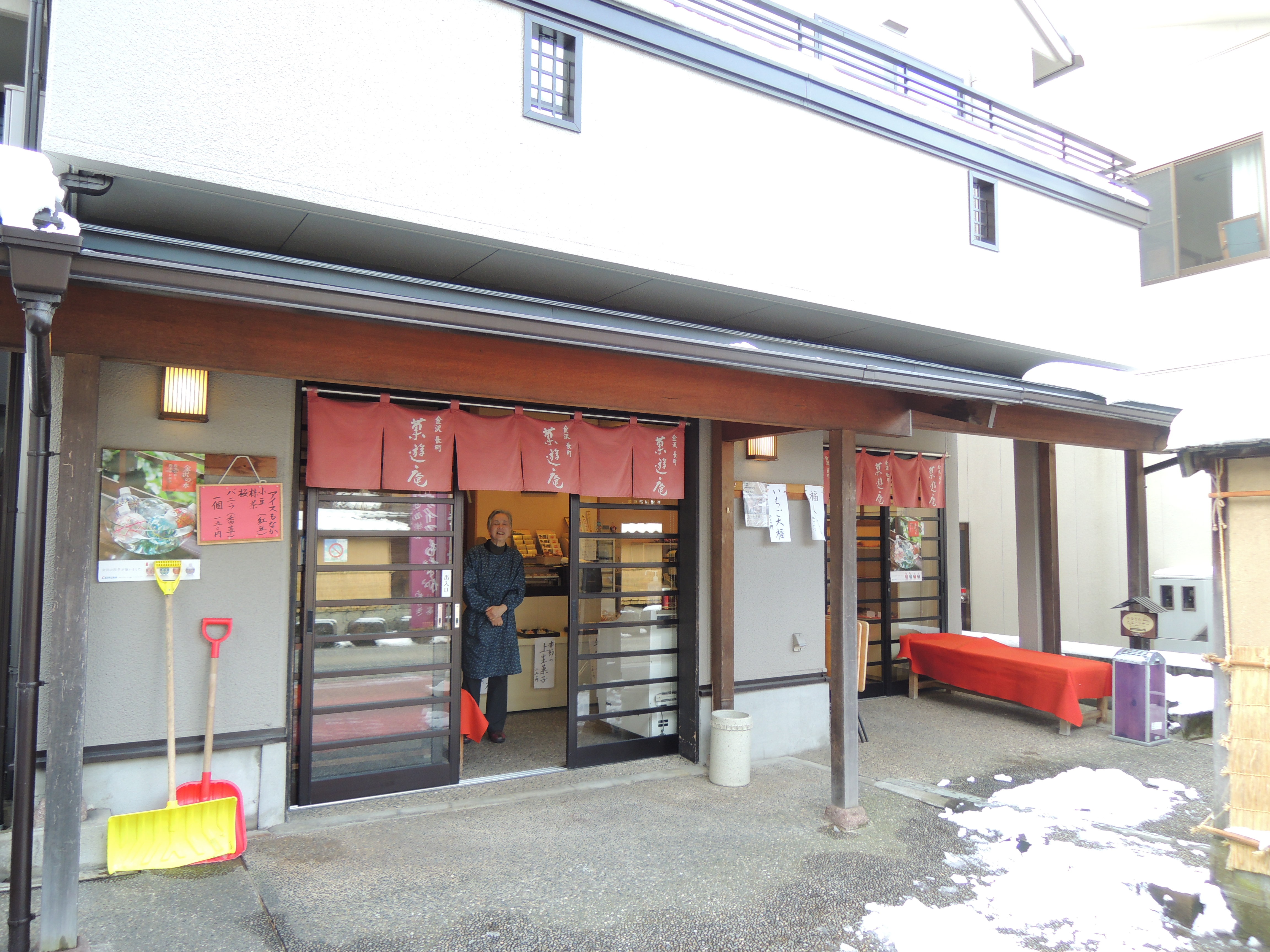 Japan flows with the seasons, and so does Kayuuan. a nice little cafe tucked in the famous samurai district Naga-machi, Kayuuan is a great place to stop by if you are looking for a traditional taste of Kanazawa sweets or tea. try out some sweets and green tea for 700 yen, or even take a short lesson where you can make your own tea, choose two sweets for 1200 yen (a great thing for couples.) almost everything in the store is made by the wonderful woman who owns it, or locally made in Ishikawa. starting in the spring, she serves shaved ice with hand made syrup and also ice cream sandwiches on rice wafers for only 150 yen. grab either one and go as you stroll around on the hot summer days here in Kanazawa. in the fall she serves Japanese chestnut treats, and in the winter she even serves the famous Japanese new years meal “osechi,” a interesting mix of famous Japanese foods.