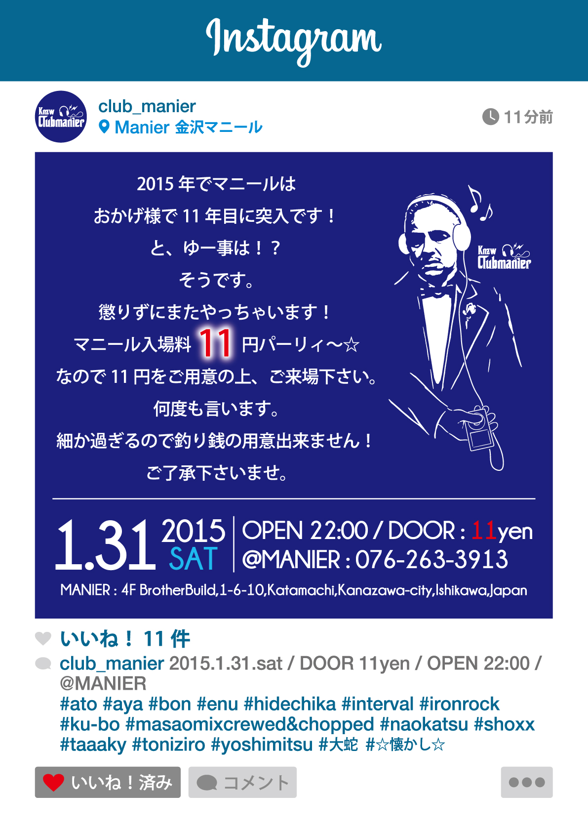 11 yen? That’s like…11 yen. Club Manier 金沢マニール is having their 11 year anniversary party this Saturday night(1/31). There is absolutely no reason not to go. Hip Hop/EDM/Techno/Dance/ #goodsoundcomingouofspeakers