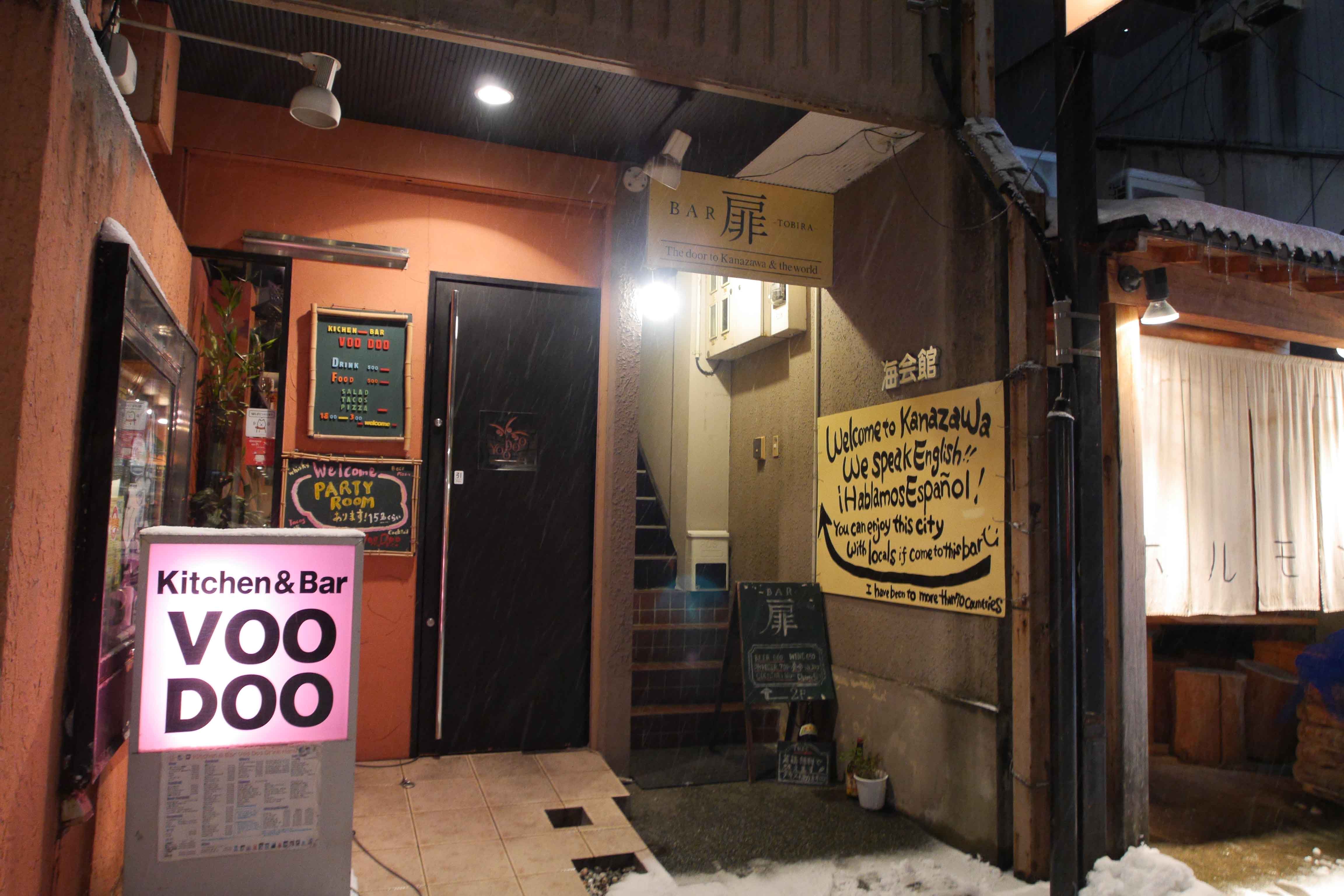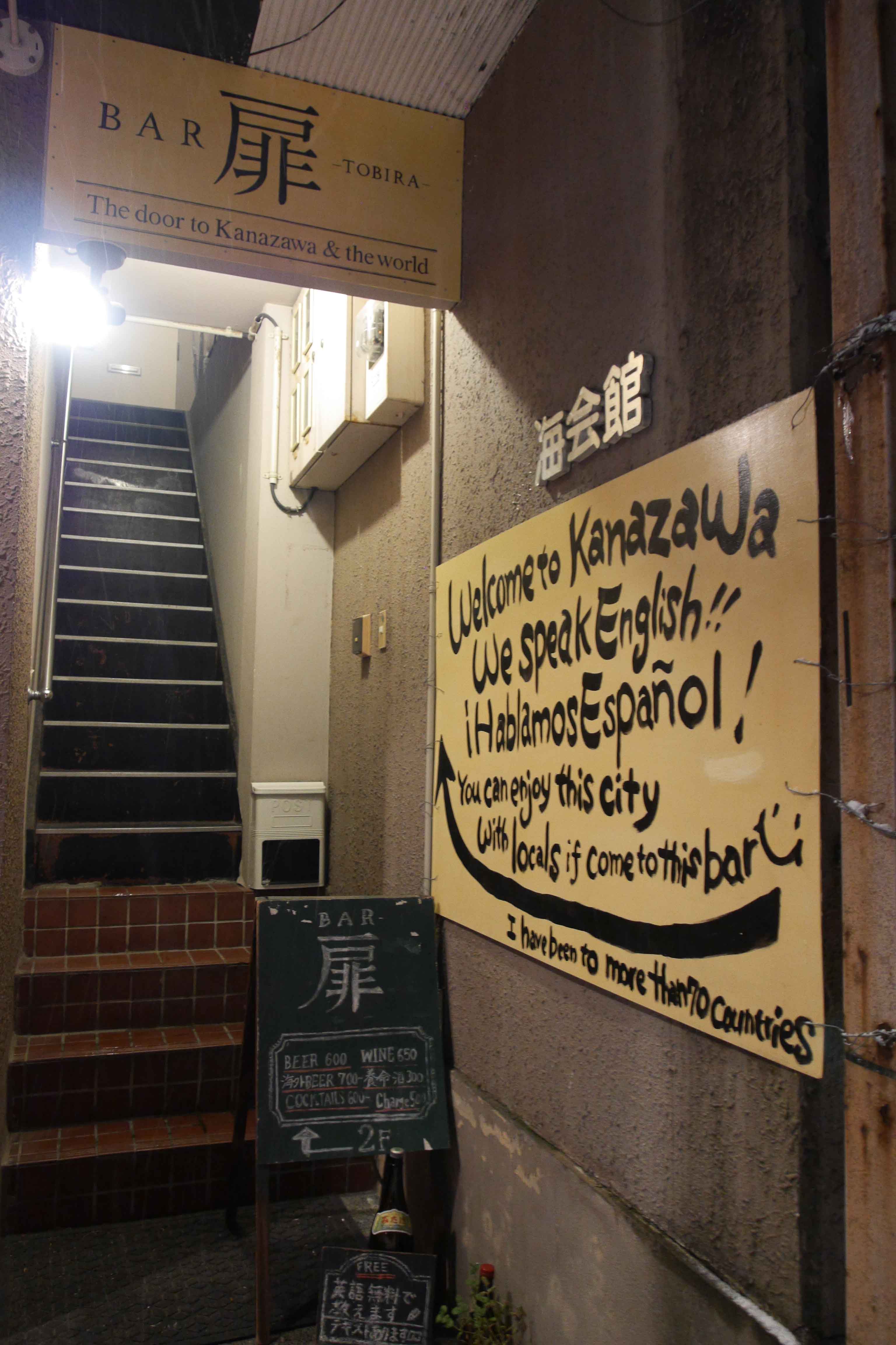 The traveler’s bar. Located on the 2nd floor, Tobira is a great place if you’re looking for good drinks and to interact with people from all over the world. The owner has been all over Japan and to over 76 countries, but came back to his hometown of Kanazawa to open Tobira. The bar has a wide range of Japanese sakes, along with beers from places like Nepal, Peru, Tunisia, Israel, just to name a few. With a counter and a few tables, it’s an intimate setting where Kanazawa locals and people traveling through come together to have a great time.